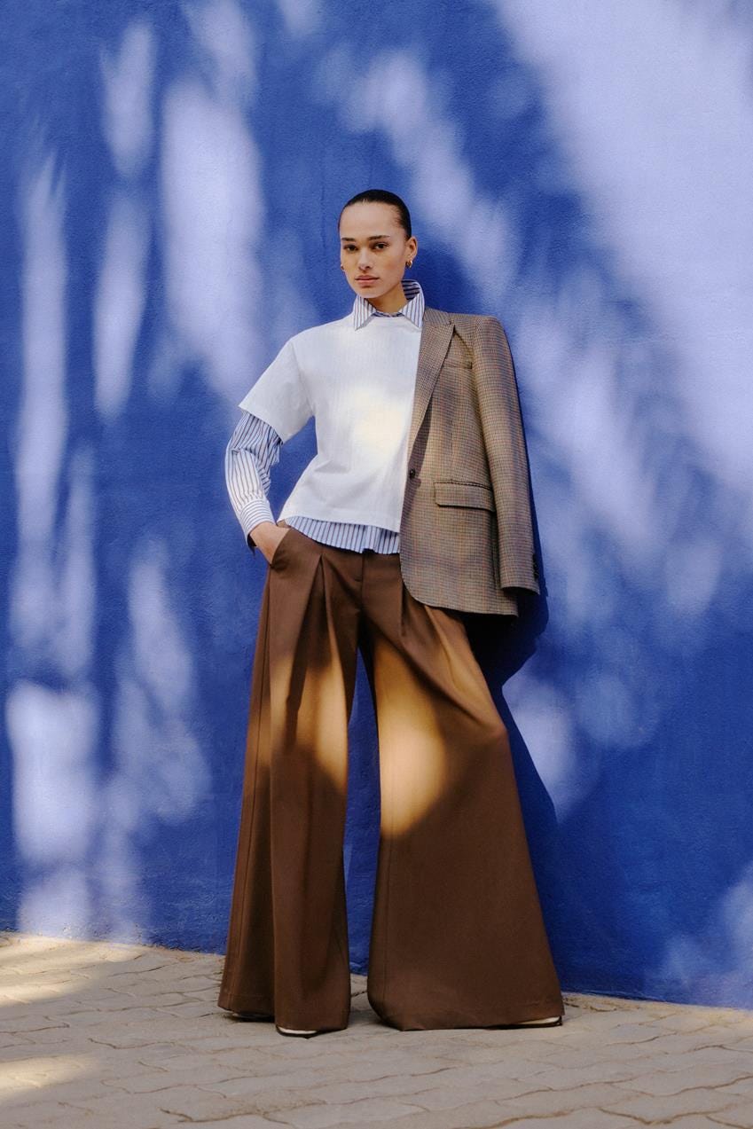 I stopped into the store, and it really is a superb selection of classic-with-a-twist wardrobe workhorses—like buttery-soft leather pants, well-fitting wide-leg Icon pants with side stripes, frayed tweed fit‑n‑flair dresses, oversized blazers, cashmere baby tees, pretty button-down shirts with scalloped collars, and interesting shoes such as olive green studded square-toe snakeskin slippers. I also really like the elevated travel wear, including a navy jacquard woven cable-knit half-zip shrunken sweatshirt with matching pants, which could go from plane to office with no problem. Most everything is in the $225 to $975 range.