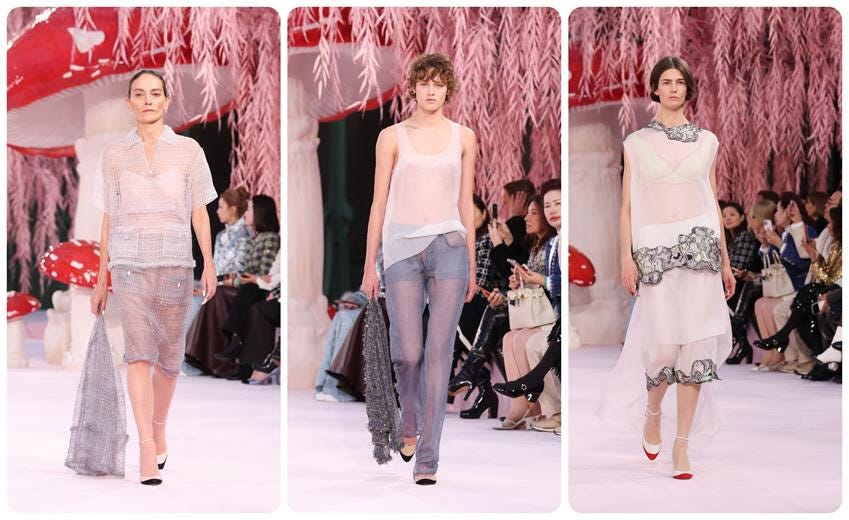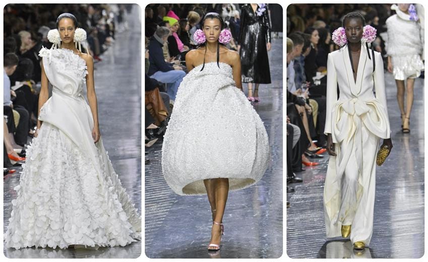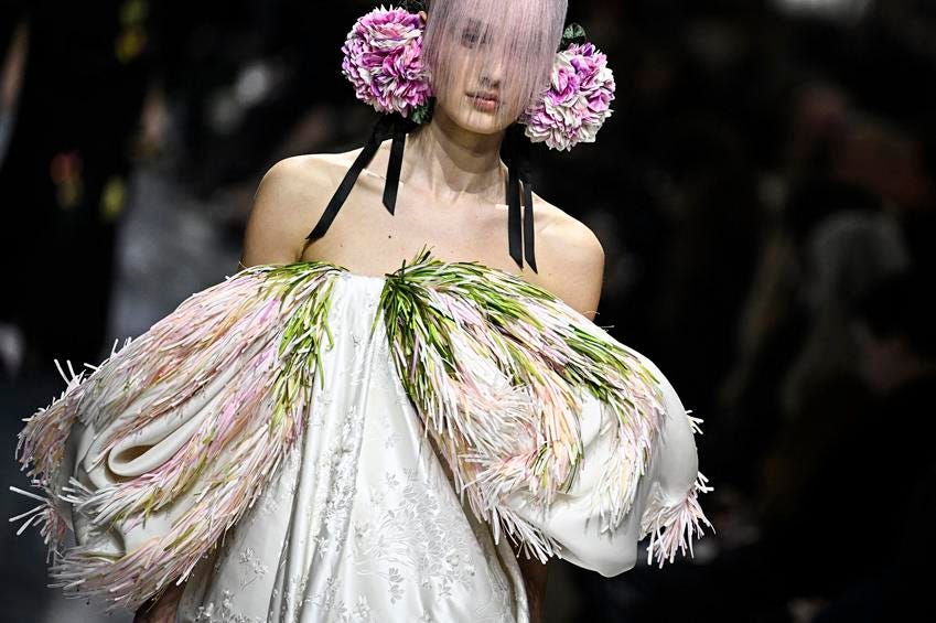 Meanwhile, at Chanel, Matthieu Blazy created another garden of couture delights—but with a much lighter touch, focusing even more on wearability. Up front, he proved just how light the timeworn Chanel suit can be, presenting it in whisper-thin silk mousseline with pearls in place of the traditional buttons, and personalized embroideries chosen by the models.