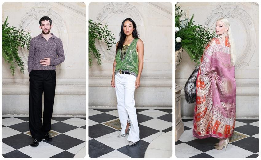 The other Dior brand ambassadors were also out in full force, including newly signed Taylor Russell and Josh O’Connor. It’s fun to see how celebrity guests wear the clothes in a more individual way than runway models. Take Greta Lee, rocking a sparkly green couture-like tank top, white jeans, and the new Dior nameplate belt. Just perfect.