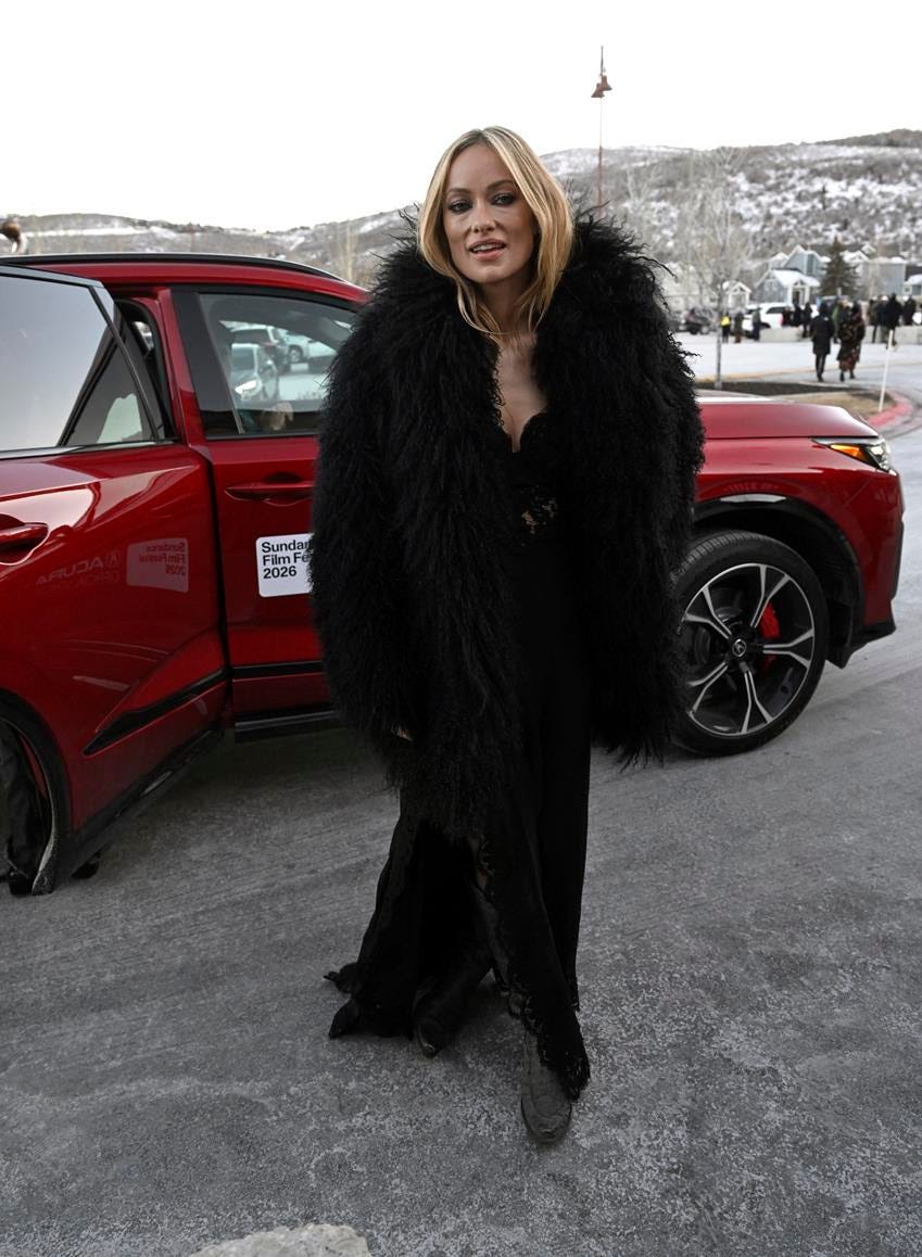 Olivia Wilde’s $1,050 Auter black hooded long-hair Mongolian shearling cast her as the queen of Sundance she’s been with her film, The Invite, debuting to rapturous reviews and sparking an all-night bidding war. Meanwhile, Charli XCX was living her best Brat life in Auter’s $950 sublime shawl-collar faux-fox chubby while promoting her mockumentary, The Moment.
