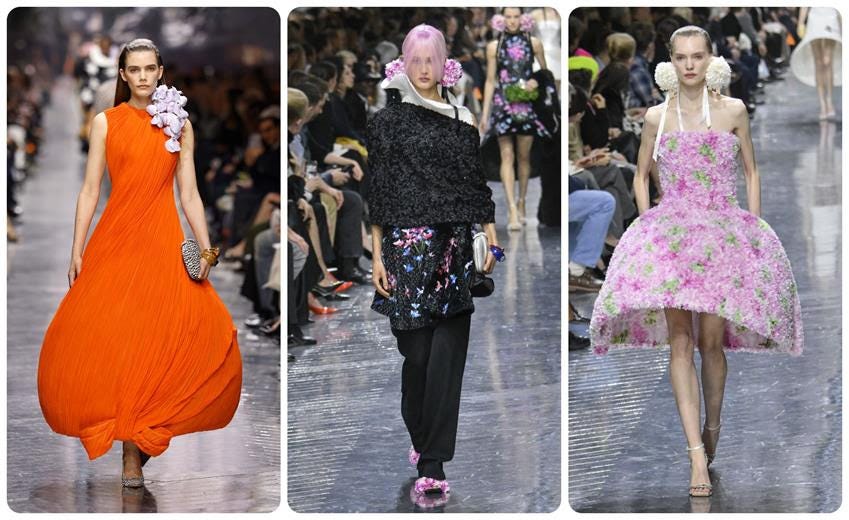 At Dior, Jonathan Anderson showed a florabundance of volumes, textures and accessories, including charming bouquets of cyclamen decorating models’ ears. The collection fulfilled the ladylike mission of the vaunted French luxury house, with plenty of Anderson’s own adventuresome knitwear and layered, more casual looks.